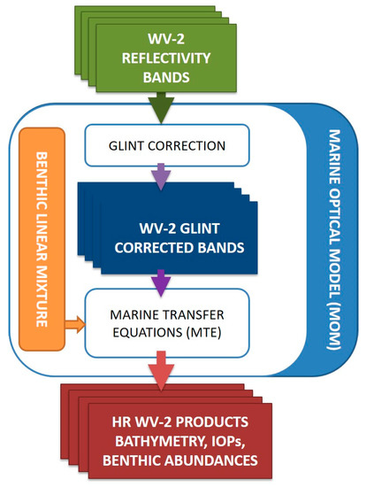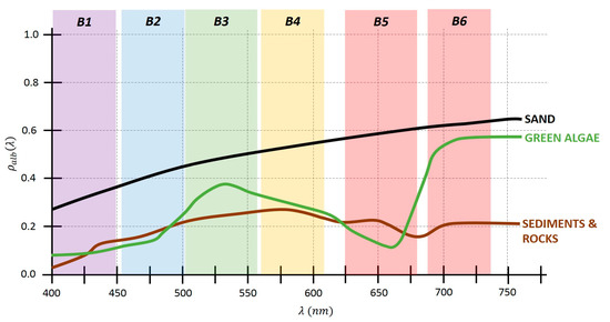 Estimating the water reflectivity using a radiative model has provided satisfactory results as it considers the water absorption and backscattering phenomena and the relationship between the seafloor albedo and the reflectivity of the shallow waters due to multiple scattering. Consequently, the recorded signal is an integration of contributions from the water column and from the bottom. In this line, some research has been performed and sophisticated models have been developed to properly separate individual signals [4,5,6]. Besides, to map bathymetry or benthic habitats, optical remote seafloor reflectance requires representations of the water-leaving reflectance spectrum as a function of depth for realistic bottom materials and water composition [7,8,9].