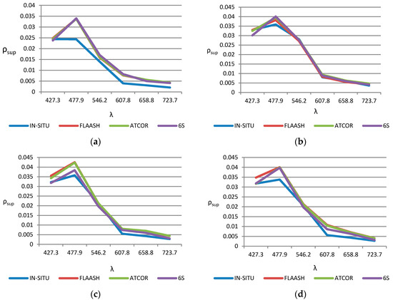 Results achieved by the three model-based atmospheric correction algorithms, FLAASH (red), ATCOR (green) and 6S (violet) are plotted in Figure 7, showing the detailed spectral reflectivity signatures, in selected locations, the nearest water points to the shore (see Figure 2), as well as the reference signature measured with the spectroradiometer (blue).