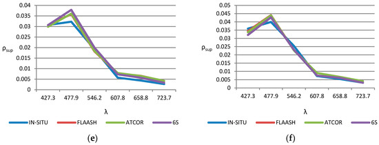 The final result of the comparison between model-based algorithms provides, for coastal shallow waters, a better suitability of the 6S algorithm, according to the RMSE and BIAS values included in Table 4. This conclusion can be qualitatively observed in Figure 7, for the nearest points to Maspalomas littoral zone and WV-2 visible bands, where the differences between the corrected reflectance respect to in-situ reflectance, for the 3 atmospheric models, are relatively low. Specifically, the 6S model has the largest spectral correlation with ground-based measurements. The largest impact of the atmospheric reflectance corrections can be appreciated in the blue band (around 0.47 µm) and, in general, in visible spectrum, between 0.4 to 0.6 µm. On the other hand, ATCOR tends to overestimate the reflectance in bands above the green one, while FLAASH causes a general overestimate in all wavelengths.