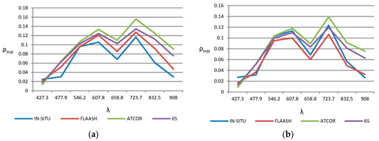 In many applications, the appropriate setting is important for an accurate atmospheric correction. In our case, the analysis of the different input parameters in the estimated reflectance led to slight changes as a consequence of the selection of the appropriate inputs for each area and date. The effects of parameter settings of the different physical models (FLAASH, ATCOR and 6S) are for both areas of study [22,23]: