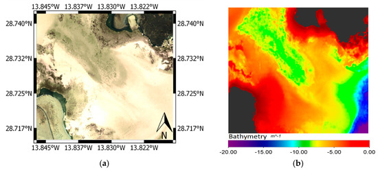 Coastal ecosystems are characterized by high biodiversity and primary production. Unfortunately, they are very sensitive to changes due to human activity, natural phenomenon, introduction of non-native species and other factors. So, given the importance of coastal water ecosystems for life quality and the global climate, systematic and efficient information is important for the monitoring of such protected areas. Consequently, the capability to map and monitor these benthic environments is fundamental for developing the corresponding management policies [1,2]. In this context, satellite remote sensing is a useful technology to monitor such coastal shallow ecosystems [3]. However, these areas are challenging as turbidity is usually present and, therefore, to derive parameters such as bathymetry or bottom features, the effects of the water column have to be accounted for.