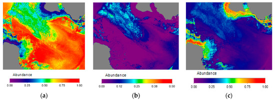 Result of the bottom lineal unmixing: (a) sand endmember abundance; (b) algae endmember abundance; (c) sediment-rock endmember abundance.