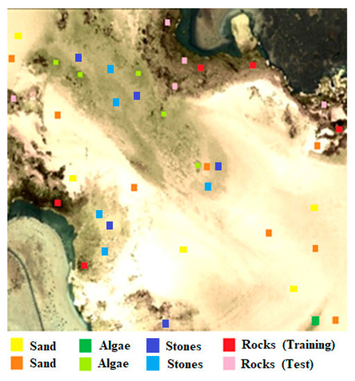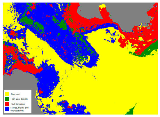 In our former research, a benthic habitat map was obtained combining the water column correction, seabed normalized indexes (seagrass, sand and rocks) and supervised classification algorithms. Support Vector Machine (SVM) [39], a machine learning classification method, was applied to the WorldView-2 corrected bands and benthic indexes. Training regions for each seabed class were defined and the Jeffries-Matusita distance was used to measure their spectral separability. Finally, the confusion matrix and the kappa coefficient were used to measure the maps quality.