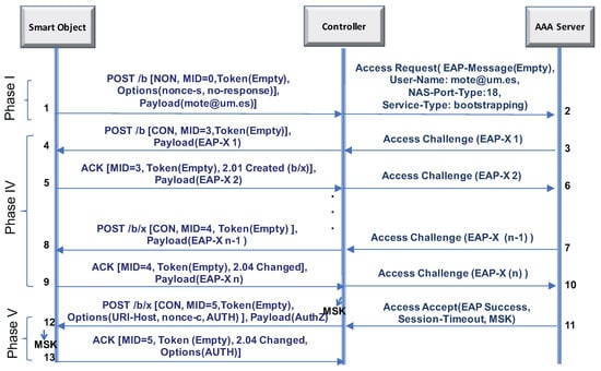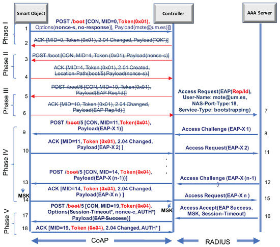 The smart object sends a POST message (Step 1) with the no-response option [42]. This option allows the smart object to signal it does not expect a response to this request. In this first message, the smart object sends a random number nonce-s carried in an option named nonce and the smart object’s identity in NAI format [26] (user@domain.org) in the payload. After this first message, all the remaining exchanges will be done with the controller acting as the CoAP client and the smart object as the CoAP server. This role choice follows the guidelines in [43] to simplify the implementation assuming that the smart object will be more constrained than the controller. The controller can now process the smart object’ identity and send it to the AAA server in a RADIUS access-request (Step 2). Typically, the identity is transported in a EAP response/identity, but this implies sending an EAP request/identity first. To save this exchange, the RADIUS (and Diameter) standard allows the smart object’s identity to be carried into an attribute called user-name instead of EAP-response/identity message. In this case, the attribute EAP-message, which contains EAP messages, will be empty in this message [44,45]. Additionally, it will include a NAS-port-type. This attribute indicates the physical port of the controller that is authenticating the user, and it is useful for the AAA server to know whether the access is being performed over an LP-WAN link, which may modulate the authorization decision and the delivery of configuration parameters for the controller. After the AAA server processes this message, it decides what EAP method is to be used based on the smart object’ identity; let us call it EAP-X. Then, it responds with the first message of the EAP method (EAP-X 1) embedded in the attribute EAP-message of a RADIUS access challenge (Step 3). When this message arrives at the controller (Step 4), it decapsulates EAP-X 1, encapsulating it in the payload of a confirmable POST message. The token value in CoAP is set to empty to further reduce the length of the message. The smart object answers this POST with a piggybacked response that contains the EAP response (EAP-X 2) (Step 5). The controller will then forward EAP-X 2 to the AAA server using a RADIUS access-challenge (Step 6), and so on. This process continues until the EAP method finishes (Steps 7–10), the number of exchanges depending on the EAP method. Finally, the AAA server sends a RADIUS access-accept with an EAP success. Along with the EAP success, the MSK is delivered to the controller with a network access lifetime (i.e., session-timeout) (Step 11). Then, the controller sends a confirmable POST message that contains a nonce nonce-c in the nonce option and authorization data like the session lifetime (Step 12) in the payload.