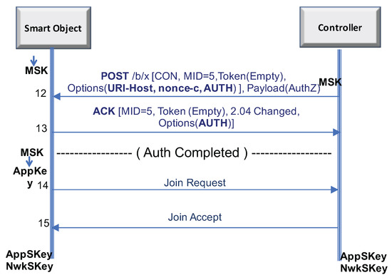 Typically, the EAP success is also included in this message. However, we do not include it in order to save bandwidth, since the EAP standard allows the EAP peer (smart object) to proceed without receiving the EAP success, but with an alternate indication of success [20]. This indication happens in two ways: (1) the reception of the confirmation POST message without EAP and with the AUTH option is an indication that the controller considers the EAP authentication finished. Second, the smart object knows that the EAP authentication went well if an MSK is available. Nevertheless, both entities still need to prove the possession of the MSK as mentioned in the EAP Key Management Framework (EAP KMF). It is worth noting that this last exchange (12–13) is integrity protected by an authentication tag embedded in an AUTH option. This provides a simple way of providing proof-of-possession of the MSK between the smart object and the controller.
