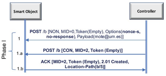 - Trigger (Phase I): To start the process in LO-CoAP-EAP, we send in the first POST used to trigger the authentication process the identity of the user in the payload of the message and the nonce-s in a new option (nonce option) for the controller. Additionally, this message carries a no-response option [42], which indicates to the controller that there is no need for a response of any kind to this request.