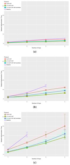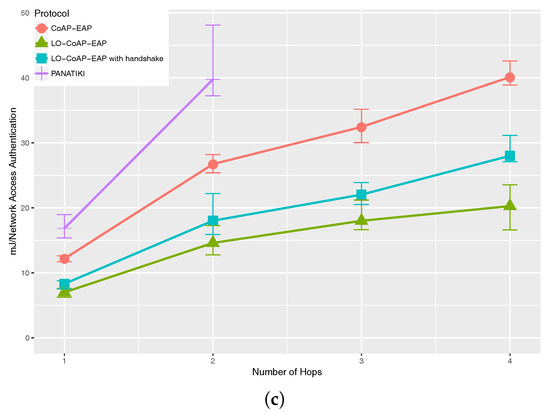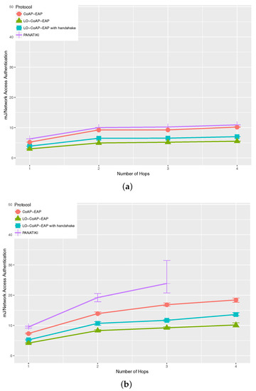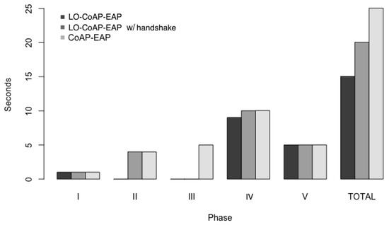 Overall, an important reduction in size of the lower layer can be appreciated. With CoAP-EAP over PANATIKI, we reduce up to ≈50% comparing the lower layer and up to ≈32% the lower layer + EAP messages. With LO-CoAP-EAP over PANATIKI, we reduce up to ≈70% compared with the lower layer, and up to ≈50% the lower layer + EAP messages. Comparing LO-CoAP-EAP with CoAP-EAP and with LO-CoAP-EAP with handshake, we have a reduction of for the lower layer and a reduction of ≈22% over the whole protocol exchange (lower layer + EAP messages). For LO-CoAP-EAP with handshake, this reduction is ≈39% for the lower layer and ≈25% for the whole protocol exchange compared with CoAP-EAP. This reduction is important to consider in very constrained links such as LP-WAN networks, as we show in Section 5.3.