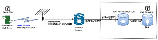 The Internet Engineering Task Force (IETF)LPWAN WG defines in its overview document [12] a generic terminology for the architecture. They define end-devices as the things, sensors, actuators, etc. The radio gateway is the end-point of the constrained link. The network gateway (or network server) is the interconnection between the radio gateway and the Internet. Finally, LPWAN-AAA is the entity in charge of managing the authentication. The LO-CoAP-EAP architecture maps to their LP-WAN counterparts as follows: the smart object is the end-device; the controller acts as the network server; and the AAA server as the LPWAN-AAA.
