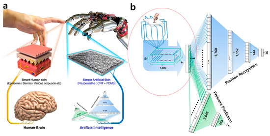 An illustrative study in [149] showing the basic concept for artificial skin and a DNN architecture for reliable sensing: (a) a schematic elucidating the comparison between the human skin and the artificial skin; and (b) the DNN architecture for tactile sensing. (Reprinted with permission from the authors [149] under the terms and conditions of the Creative Commons Attribution license (http://creativecommons.org/licenses/by/4.0/)).