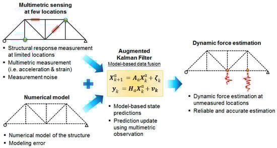 Conventional formulation of the Kalman filter described above in (11) and (12) can provide optimized estimates of the structural responses as the states (i.e., displacements and velocities) with given information of input forces (f). However, the input forces are rarely known in reality, so additional methods are needed to estimate the input forces [6,25].