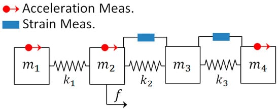 A force (f) is applied on the 2nd mass (DOF) and the acceleration of the 1st, 2nd, and 4th DOF are measured, and the strain between the 2nd and 3rd and between 3rd and 4th DOF (masses) are measured. In the observation (measurement) vector, the first row has information of acceleration of first mass; second row has information of acceleration of second mass; third row has information of acceleration of fourth mass; fourth row has the strain between 2nd and 3rd DOF and the fourth row has the information of the strain between 3rd and 4th DOF: