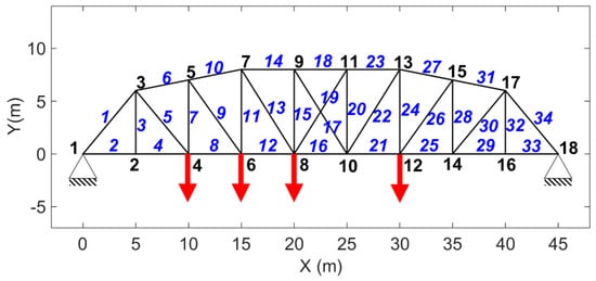 The model of the truss used for simulation—Blue italic numbers show the member number and the black ones indicate the node numbers. There are eighteen nodes and 34 members; Red bold arrows show where the simultaneous excitations are applied.
