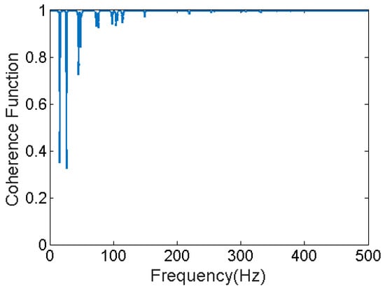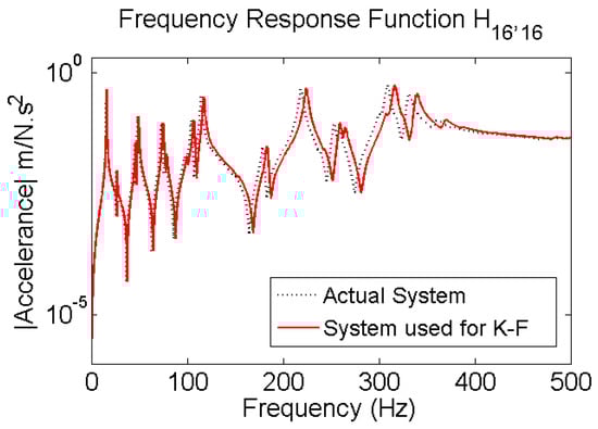 Responses of a planar steel truss structure model (see Figure 4) with 18 joints and 34 members are simulated using the fourth order Runge-Kuta method [53]. The time step for response simulation is 1/4096 s. Quality of the simulation is validated by calculating the multiple coherence function [54] shown in Figure 5. The coherence function is a scalar value between zero and one; in which one indicates the outputs are fully due to the inputs. At resonance, there are some drops; which are partly due to small numerical errors in solving the equation of motion and mainly due to spectral leakage and biased and random errors of spectral estimations (see [51] pp. 205–240), because finite amount of data is used to do so. The structure with its node and element numbers is depicted in Figure 4, and the properties of the elements are given in Table 1. A modal damping ratio of 0.7% was considered for all the modes of the structure. In Figure 4, red bold arrows show the applied force locations in the structure; four different excitations are simultaneously applied to the system. H16,16—Frequency Response Function (FRF) of the system between measured DOF “16” and excitation at DOF “16”, called point FRF—is shown with a dotted line in Figure 6. DOF “16” is vertical direction of joint 8. This system is used for response simulations. To have realistic situation for force estimation, the same system used for simulation is not used in the Kalman Filter. This is done because a perfect model of the structure almost never happens. A slightly different model which is 5% stiffer is used representing a modeling error (5%). The point FRF (H16,16) of this stiffer model used in K-F is shown by red solid line in Figure 6.