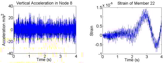 In Figure 7 typical accelerations and strains responses from the numerical simulations, when the system is subjected to the combination of different forces simultaneously applied to the structure, are shown. In the right of Figure 7, low-frequency variations can be clearly observed in the strain data due to very low frequency excitations applied to the system, but not in acceleration data; which are intrinsic characteristics of acceleration and strain measurements.