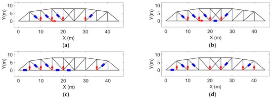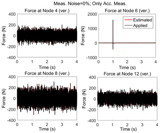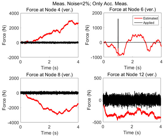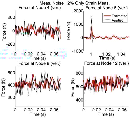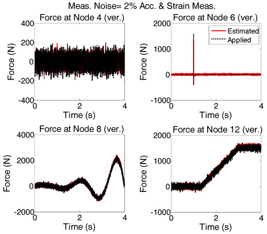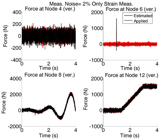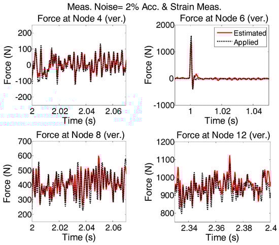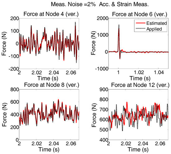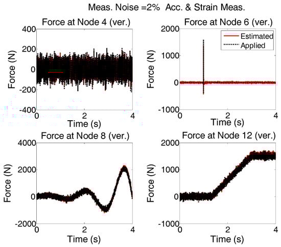 Four different strain and acceleration arrangements to measure the responses of the structure are considered (Figure 20). The quality of input force estimations for the applied forces described in “case 2”, when modeling errors and measurement noises are present, are compared and plotted in Figure 21.