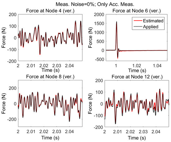 It is seen that the results in the former sensor configuration (set “a”) for the strain and acceleration is better particularly the estimated force at Node 12. Generally, having sensors closer to the input locations increases the quality and accuracy of estimation [18,41]. It is observed that for the current formulation, using multi-metric measurements solves the stability issue. But if accurate estimation of excitation for a certain location is desired, there should be a measurement point close to that location.