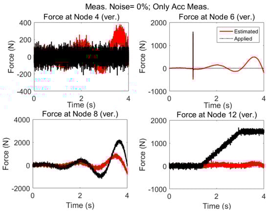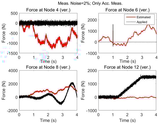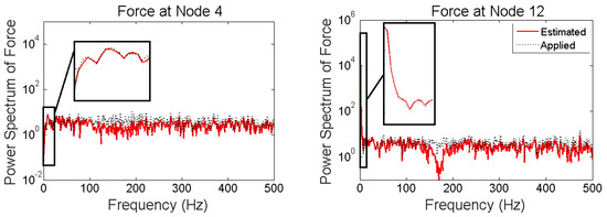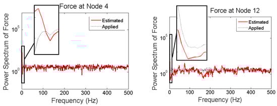 It is seen that in the multi-metric case, i.e., deploying strain and acceleration measurements together, the best results are achieved in low-frequency as well as high-frequency and the estimation is stable. Frequency content of estimated and applied forces at nodes 4 and 12 are shown in Figure 18.