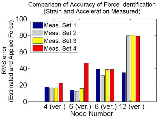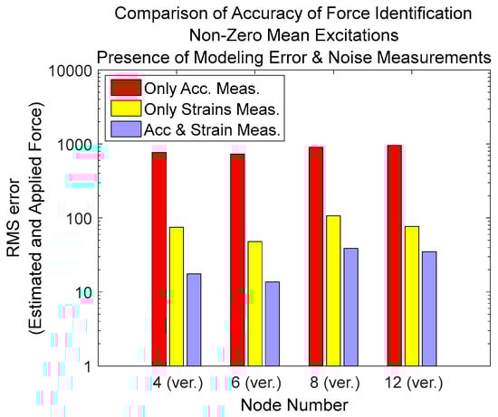 For the purpose of comparing the quality of input estimation based on different types of responses or their combinations, the root mean square of the difference between estimated and applied force vectors is calculated using Equation (38) and is plotted in Figure 19: