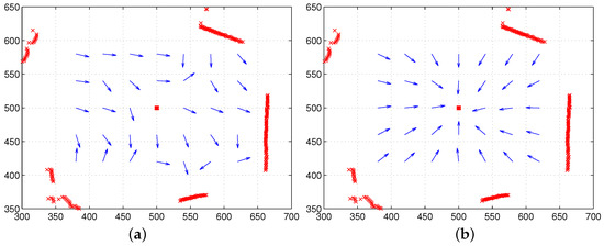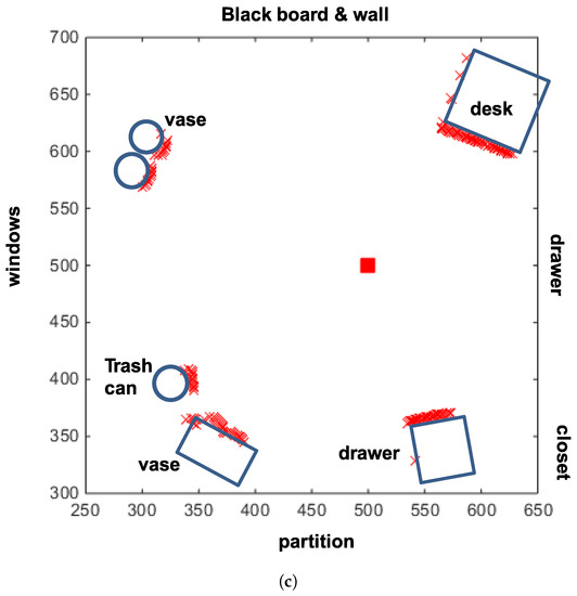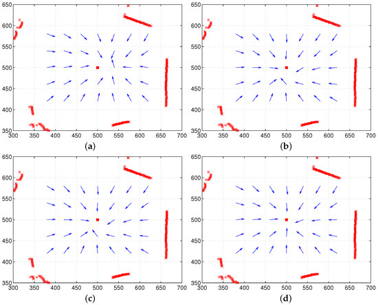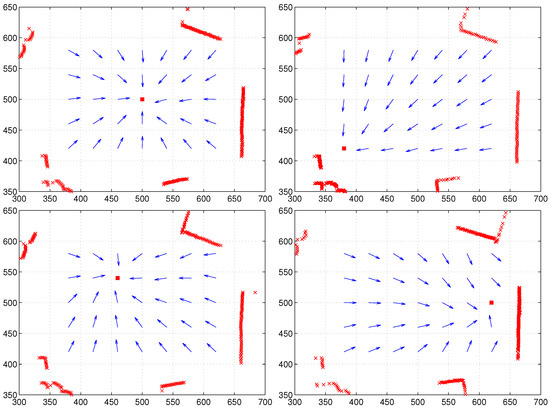 In the moment model, we can allow variable features in . In our experiments, we will mostly use the RGB color intensity as the feature value. To compare variable visual features and no visual feature, we can test for equal color intensity. In addition, the moment model requires the distance information to calculate the centroid. Since there is no distance information of landmarks in the image set, we estimated the distance using the ground line in the image, which was used for the moment model. The ground line is the boundary line between the floor and an object in the panoramic image. After blurring the whole image, a moving mask (4 × 2 pixels) to detect the horizontal edge was applied, and the number of pixels between the horizontal line and the detected ground line was counted to estimate the distance; more pixels counted indicate a larger distance to the ground or the landmark. We discriminate the methods with the ground-distance estimation in the visual image and those with the laser sensor readings for distance.