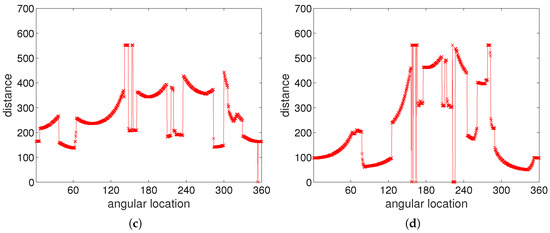 Figure 4c,d shows range data from laser sensor readings corresponding to the panoramic images. The snapshot images or snapshot distance maps have a similar landscape, but they are distorted depending on the position.