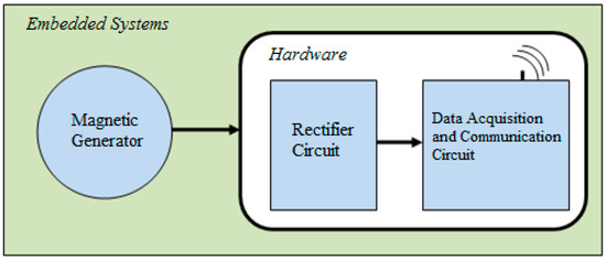 The proposed system represented by the block diagram in Figure 1 is formed by an energy generating device and a hardware. The hardware is divided into two printed circuit boards, one to house the data acquisition and communication circuit and one to the power circuit.