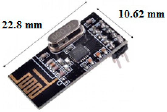 To choose which RF module would be most appropriate for our application, the following criteria were considered: small size, low power consumption, low cost and the possibility to send and receive information (transceiver). The one that most approached these characteristics was the NRF24L01 of the manufacturer Nordic Semiconductor®, shown in Figure 3.