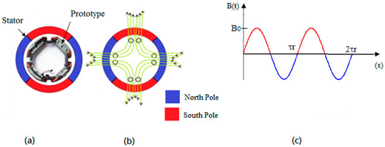 Arrangement of the generator coils in relation to the four poles generated by the stator. (a) Physical device; (b) simplified representation; (c) stator magnetic flux wave form.