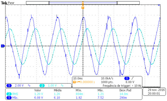 In order to analyze the response of the generating device, a test was performed with the rotor blocked, the stator received a current of 10 A. With the oscilloscope the images for Figure 15 were obtained.