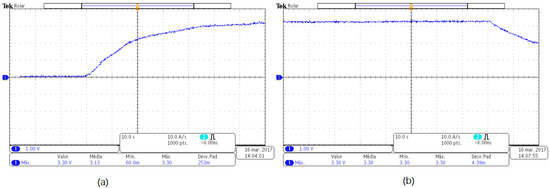 Approximately 25 s after the engine was energized, the computer started to receive the temperature information sent by the prototype. At that time, the voltage in the data acquisition and communication circuit reached 2.42 V. In approximately 70 s the voltage stabilized at 3.3 V until the motor shutdown, as seen in Figure 15b.