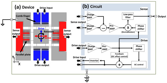 Microelectromechanical systems (MEMS) vibratory gyroscopes are among the most commercialized MEMS products. The vibrating structure based on MEMS, instead of complex optical components, allows gyroscopes to be simple, small, and inexpensive compared to conventional optical gyroscopes [1,2,3]. Recently, with the advantages over conventional macro-scale gyroscope, they have been increasingly mass-produced and used in applications ranging from consumer electronics to vehicle. In the case of consumer electronics, they allow gesture recognition in smart phones and image stabilization in cameras. In the automotive case, they are used for vehicle stability control, roll-over detection, and Global Positioning System assistance [4]. A MEMS vibratory gyroscope can be decomposed into a MEMS device and electrical circuit components. The MEMS device includes mechanical transduction of the angular rate into an inertia force via the Coriolis effect followed by electromechanical transduction using a variable capacitor to obtain an electrical signal [5,6]. The electrical circuit component is required for subsequent signal processing and feedback control to ensure that oscillation remains stable. Owing to the integration of silicon MEMS/complimentary metal–oxide–semiconductor, a MEMS device and its electrical circuit components coexist on a small single silicon substrate with low cost and volume [7].