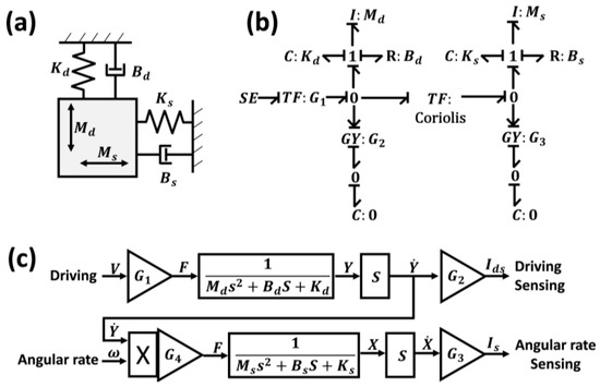 For integration to the circuit simulation, the gyroscope should be expressed as a transfer function. Therefore, the gyroscope was systemically analyzed, as shown in Figure 2a. We assumed that the gyroscope has two degrees of freedom with mass (M), spring (K), and damper (B) elements in the X (sense) and Y (drive)-axes [24]. This lumped mass–spring–damper model can be expressed as a bond graph, which is a graphical representation of a physical dynamic system, for better understanding of the mathematical relationship [25], as shown in Figure 2b. The effort source (SE), which is the applied input voltage generated by the electrical circuit, was converted into a force on the Y (drive)-axis by a transformer (TF:G1: comb-drive). Consequently, the force induced a motion along the Y-axis, which is governed by the mass (Md)–spring (Kd)–damper (Bd) elements. The velocity of the motion along the Y-axis was multiplied by the angular rate of the transformer (TF: Coriolis), thereby becoming a force on the X (sense)-axis, which is also governed by the mass (Ms)–spring (Ks)–damper (Bs) elements. The motion in the Y and X-axis was detected as an electric current through each gyration, namely, GY:G2: comb sense and GY:G3: parallel plate sense, respectively. Subsequently, according to the understanding of the dynamics and response characteristics revealed in the bond graph, the equivalent system model of the gyroscope could be described [26], as shown in Figure 2c. Thus, the relationship between the input and output of the gyroscope can be mathematically expressed as follows:
