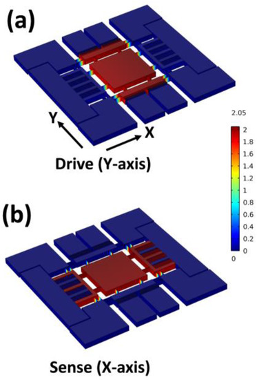 Graphical result of the numerical simulation for the displacement due to the applied force on the (a) Y (drive) and (b) X (sense)-axes.