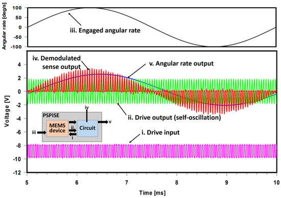 Signals from the combined simulation of the gyroscope and its driving and sensing circuit. (i) Drive input: the signal generated from circuit and applied on electrodes at MEMS device for oscillation. (ii) Drive output: the oscillation signal detected by electrodes at MEMS device followed by an amplification. (iii) The rotation engaged to the gyroscope. (iv) The demodulated sensing signal containing the applied angular rate. (v) The extracted angular rate output.