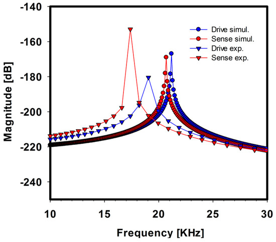 According to the system modeling of the gyroscope, the frequency response was obtained by simulation. For comparison, the actual device was also measured, as shown in Figure 6, which indicates its natural frequency. In the simulation, the drive and sense axes had 10% and 16% lower natural frequency, respectively, than the actual measurement. We assumed that the spring element, which is the support structure for the proof mass, was over-etched, thus resulting in a lower spring constant and natural frequency.