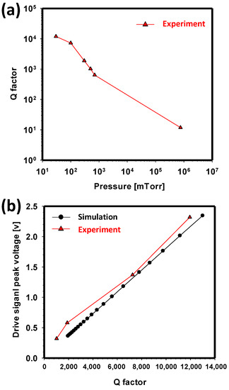 The damper element, which is the friction mainly caused by viscous-film damping, plays an important role in the gyroscope performance, such as the amplitude of the drive and sense oscillations. Thus, maintaining a high quality factor (lower damping coefficient) results in lower power consumption, improved stability, and increased sensitivity. Therefore, a gyroscope is usually vacuum-packaged to minimize viscous damping. Thus, accurate Q factor prediction as a function of the vacuum pressure is highly needed. Although the damper element can be estimated using a simplified equation, as mentioned earlier, theoretically estimating it for a complicated gyroscope system is usually very difficult compared with the other factors due to the complexity and nonlinearity of the fluid motion [30]. Hence, the quality factor at various air pressure values is measured using an actual device, as shown in Figure 7a. Then, simulation is conducted based on this parameter. To compare and validate the experiment, a drive circuit without feedback control is connected to the gyroscope for self-oscillation and measurement of its drive signal in both simulation and experiment. Both results show similar trends, as shown in Figure 7b.
