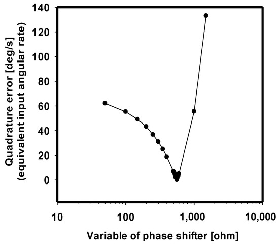 The optimization of demodulation is also inevitable to reject quadrature error. Due to mechanical imperfection, a small portion of the drive motion is also delivered directly to the sense-axis. This coupling creates an undesired feedthrough signal known as quadrature error due to its 90° phase shift relative to the drive signal. Generally, the quadrature error is much larger than the signal of the Coriolis Effect and, thus, must be rejected by demodulation. Figure 9 shows the quadrature error as a function of the phase-shifter parameter. The graph shows that quadrature error is almost rejected at the optimal point, 560 Ω, where the sense output signal is demodulated by exactly the same phase as the drive output signal.
