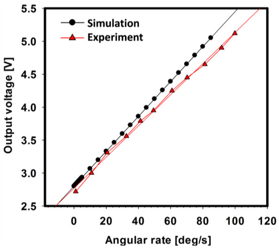 On the basis of the optimization by simulation, a test circuit was fabricated and integrated with an actual gyroscope. Similar to the simulation result, the gyroscope was successfully self-oscillated and responded to an angular rate. Figure 10 shows that the output characteristics of the gyroscope were measured from both simulation and experiment at 30 mTorr. The result shows that the voltage of the gyroscope was linear and a function of the angular velocity with a scale factor of 26.5 mV/(°/s) in the simulation and 23.6 mV/(°/s) in the experiment. The result reveals that this integrated simulation represented the operation of an actual device with an electrical circuit well.