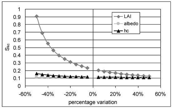 In Figure 2 the sensitivity coefficients for kc are reported for LAI, albedo and vegetation height considering a variation from the mean value of ±50%, using the meteorological variables to compute energy fluxes measured by an eddy covariance station located in a maize field in Northern Italy [50].