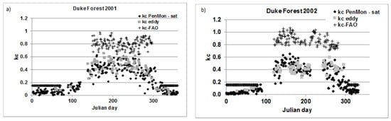 Crop coefficient values for Duke forest eddy covariance station for: (a) 2001; and (b) 2002.