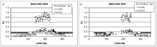 In Figure 6 crop coefficient values are reported for 2006 and 2007 for the Black Hills station. Even though the station is located in an evergreen forest, evapotranspiration substantially decreases during the winter period and so the crop coefficient does.