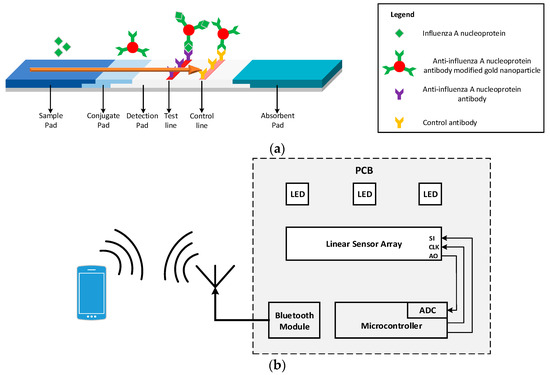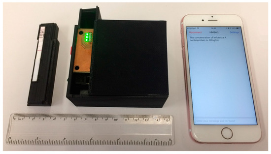 Many readout devices for the quantification of analyte present in the sample in LFIAs using various methods have been reported. The most common methods are either based on image analysis or on systems that use available discrete components. In the first case, an image of the LFIA is taken—usually using the camera of a mobile phone—and the image is processed using the mobile phone’s resources. Even though these types of readers have fast implementation and are very cheap, they are extremely susceptible to ambient light, focal distance, and tilt [