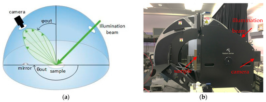 21]. It uses a light beam to illuminate the surface at various angles and then measures the scattered light from the surface to a camera. Due to the highly reflecting coating on the inside of the sphere and the convex mirror, the camera is able to measure the reflected radiation distribution over a full hemisphere (azimuth and elevation angle) [