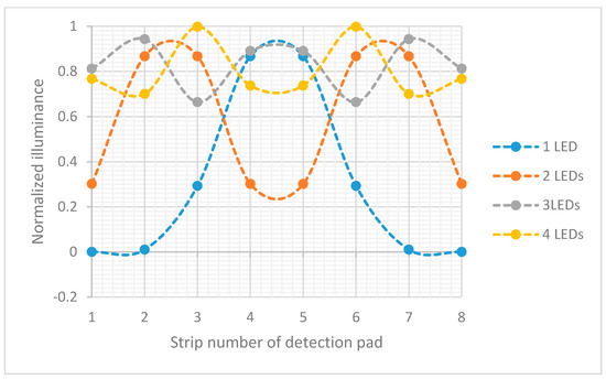Figure 3 shows the normalized illuminance for each area in the detection pad. The LEDs had 525 nm wavelength and were equally spaced along the