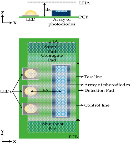 The detection pad of LFIA was designed to be placed above the array of photodiodes (see
