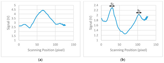 Figure 9b shows the calculated signal for the strip of 20 ng/mL concentration after the background correction. Due to implementation of this correction, the data reversed compared to measures data from the device and the maximum values represents the signal from the test and control lines. From the derived signals, the maximum value was detected for the first 20 to 50 pixels (124 pixels scan 8 mm) of each strip and then the average value of this maximum and the maxima of the ±4 adjacent pixels calculated. The calculated value corresponds to the signal of the test line (S