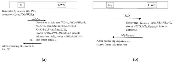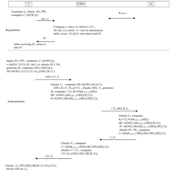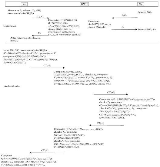 Jung et al.’s authentication scheme [29] is shown in Figure 3. This scheme consists of three phases: registration, login and authentication, password change. This scheme has not sensor node registration phase. When the sensor node is developed, a shared key KGWN_S between the sensor node and the GWN is assigned.
