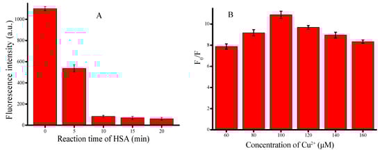 Optimization of experimental conditions. (A) Changes in fluorescence intensity with reaction time of HSA (0, 5, 10, 15, 20 min); (B) Changes in fluorescence intensity with different concentrations of CuSO4 (60, 80, 100, 120, 140, 160 μM). Error bars were estimated from three replicate measurements.