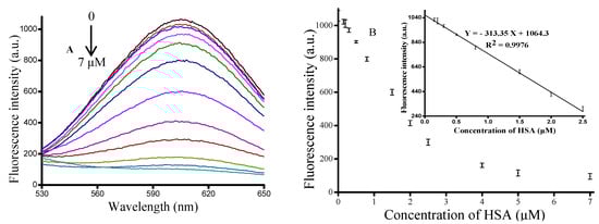 (A) Fluorescence emission spectra of the concentration of HSA (0, 0.15, 0.2, 0.3, 0.5, 0.8, 1.5, 2, 2.5, 4, 7 μM). Optimized assay conditions were used; (B) Graph depicting the changes in fluorescence output at 610 nm as a function of HSA concentration. Inset: Linear relationship between fluorescence intensity and low HSA concentrations. Error bars were estimated from three replicate measurements.