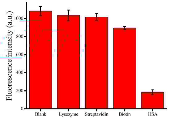 We tested several proteins, such as lysozyme, streptavidin and biotin, by the proposed assay under the optimized concentrations to investigate the selectivity. As seen in Figure 4, we found that none of the proteins influenced the synthesis of CuNPs except HSA. That’s to say, the proposed assay was specific for the detection of HSA, showing a great potential in biological samples.