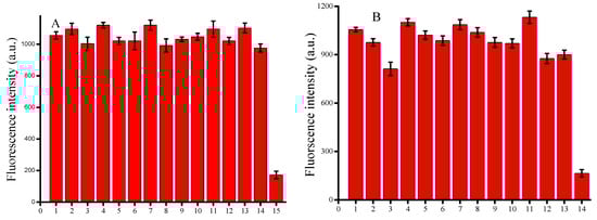 (A) Fluorescence emission spectra of the reaction system with HSA (7 μM) and various ions (7 μM) under the optimized concentrations. 1, Blank; 2, K+; 3, Mn2+; 4, Ca2+; 5, Na+; 6, Mg2+; 7, Li+; 8, Al3+; 9, Zn2+; 10, Hg2+; 11, Cl−; 12, NO3−; 13, SO42−; 14, CO32−; 15, HAS; (B) Fluorescence emission spectra of the reaction system with HSA (7 μM) and various organics (7 μM) under the optimized concentrations. 1, Blank; 2, arginine; 3, glutamic; 4, glycine; 5, isoleucine; 6, leucine; 7, lyscine; 8, valine; 9, proline; 10, alanine; 11, glucose; 12, sucrose; 13, carbamide; 14, HSA.